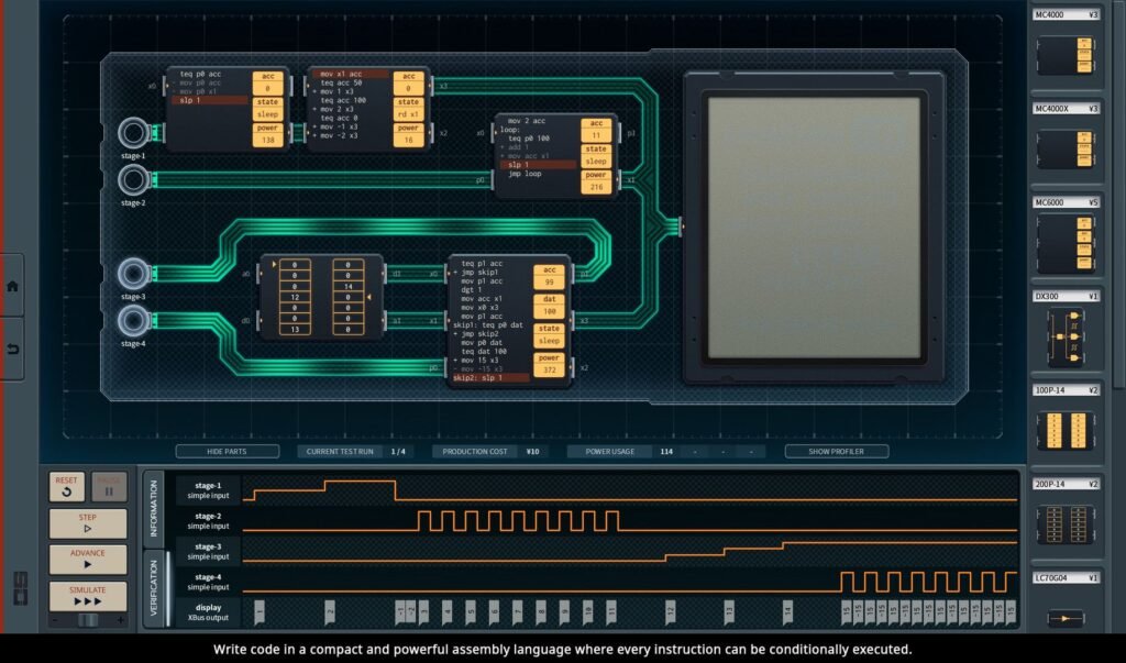 SHENZHEN I/O ist ein von Kritikern hochgelobtes Puzzlespiel, in dem man elektronische Schaltungen entwirft und baut. Es bietet eine einzigartige Mischung aus herausforderndem Gameplay und lohnendem Problemlösen und führt die Spieler schrittweise an immer komplexere Konzepte der digitalen Logik heran.